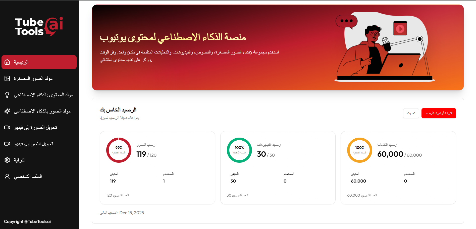 حوّل طريقة إنشاء وتطوير محتوى اليوتيوب باستخدام منصة ذكية تجمع كل ما تحتاجه في مكان واحد, مع أحدث تقنيات الذكاء الاصطناعي، ستتمكن من إنتاج محتوى أسرع، بجودة أعلى، وبأقل مجهود